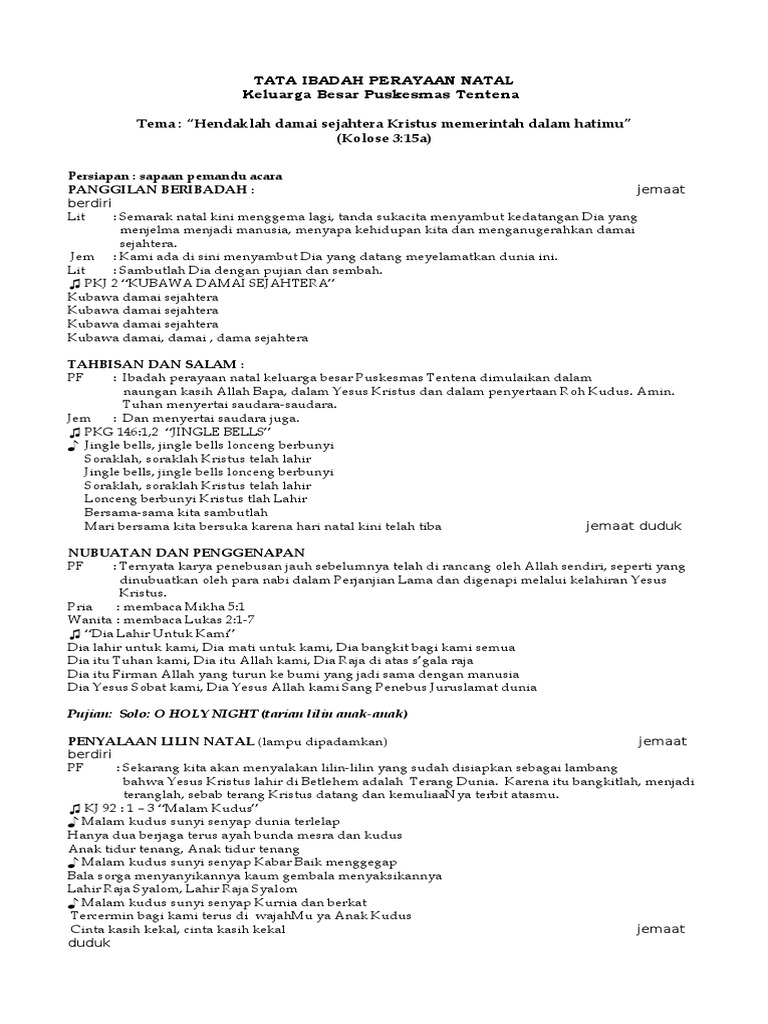 Tata ibadah perayaan natal oikumenedeskripsi lengkap. Bukan hanya pemuda, tapi semua memang membutuhkan tata ibadah atau yang biasa disebut liturgi, untuk memandu jalannya ibadah. Prolog dari pemuda pujian dari pemuda panggilan beribadah : Sebelum memulai ibadah perayaan natal ini marilah kita saat teduh sejenak, saat teduh dimulai……. Dari sie bapa,inang,pemuda,vocal solo asm.
